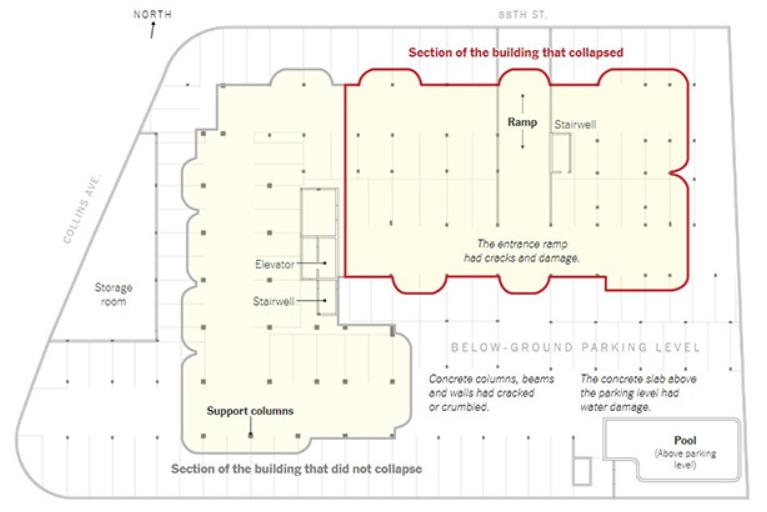 迈阿密所在的佛罗里达州是美国沿海地区中空气悬浮盐颗粒浓度较高的地区,海水对建筑造成的侵蚀也是目前作为可能因素正在进行调查的项目之一。结构工程师兼加利福尼亚州地震安全委员会主席吉·宫本博士(Kit Miyamoto)就此对美国有线电视新闻网(CNN)表示,这次垮塌是典型的“支柱失效”现象造成的,这表示原本支撑着大楼的一系列承重支柱失去了应有的作用,但具体是什么原因导致“支柱失效”现象的出现,需要等待联邦和州政府层面工程师的进一步分析。