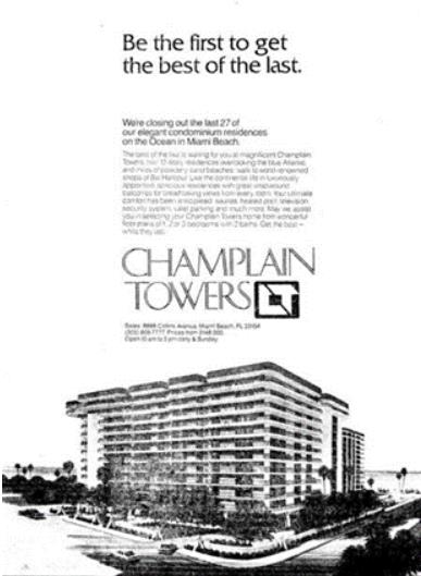 1980年,《迈阿密先驱报》的一则广告还将尚普兰塔公寓吹捧为“优雅的共管公寓”,“您的终极舒适已在意料之中:桑拿、恒温游泳池、电视安全系统、代客泊车等”,“只需14.8万美元”, 广告写道。